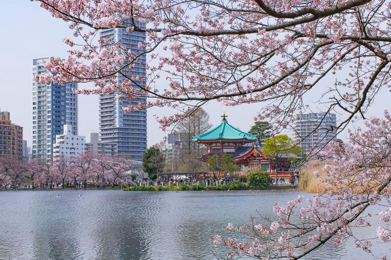 不忍池は公園の南側にあります。約11万㎡の天然池です。古くから桜の名所として知られ、「さくら名所100選の地」にも選ばれています。