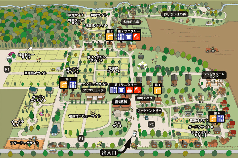敷地は、3万坪ほどあるようです。オートキャンプ場、ツリーハウス、宿泊施設、などたくさんの施設があります。